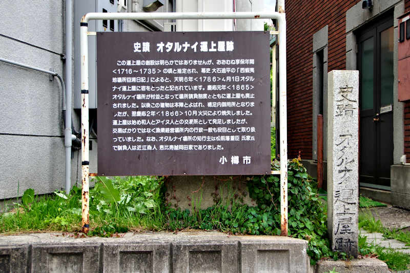 オタルナイ運上屋の設置に関しては定かではないが享保年間と考えられ、元々はヲタスツにあったらしいと云うことだ。知行主は松前藩重臣の氏家氏、場所請負人はの恵比寿屋岡田家でしたが、慶応元(1865)年にオタルナイ場所が村並となり場所請負廃止となり、運上屋は本陣に変わっているが、引き続き駅逓を運営していたが慶応2(1866)年の火災により建物は消失、運上屋の本陣は1年程の期間で、移転再開と思うがその後については不詳。メルヘン交差点側に「史跡オタルナイ運上屋跡」の碑がある。小樽が山越内や長万部と同年に村並みになったのは場所請負人だった恵比寿屋が新政府(開拓使)に協力的でなかったからともささやかれていたようだ。北海道の名付け親、松浦武四郎は弘化3年、安政3年に1泊、安政4年には2泊し、その時の様子を書き残している。西蝦夷日誌(松浦武四郎著)では「上に弁天社・地蔵堂、階段敷級を上がる。ここより諸方を眺望する風景宜く、一眸に石狩までよく見ゆ」とあり蝦夷日誌(松浦武四郎著・西蝦夷編)ではヲタルナイという所は元々クッタルシという所でヲタルナイは石狩との境界になっている小川であると記した。◇所在地:小樽市堺町6