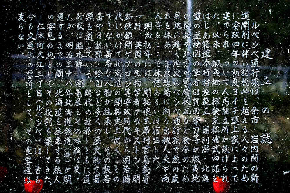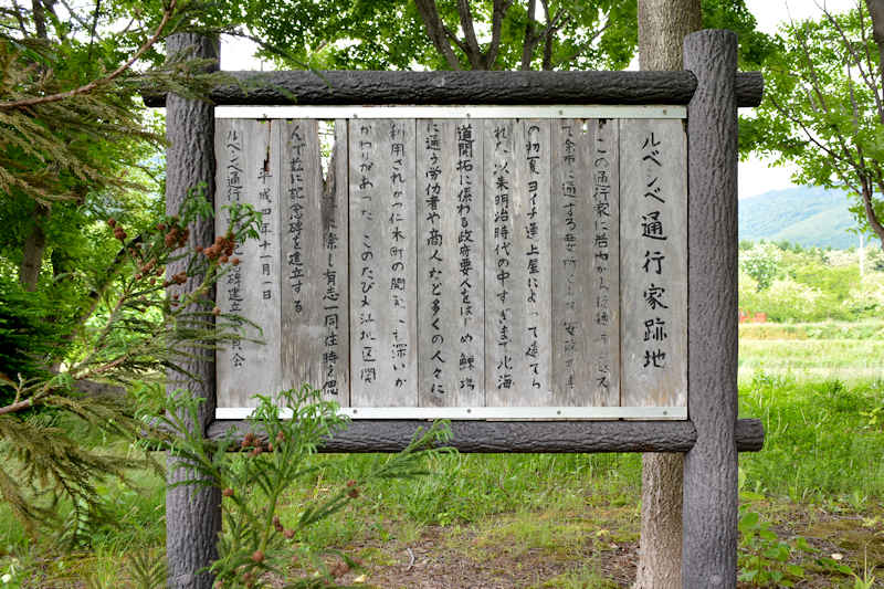峠の仁木町側にはルベシベ通行家跡地に記念碑(ルベシベ川と稲穂川の合流部付近)と説明板があり碑文には『建立の誌 ルベシベ通行屋は余市、岩内間の新道開削に伴い稲穂峠を越える旅人のために安政4年の初夏余市運上家によって建てられ、次いで人馬継立が設けられた。以来、蝦夷地の探検家松浦武四郎をはじめ函館奉行村垣範正、堀利凞、北海道の歴検図の筆者目賀田帯刀が蝦夷地の開拓や北方の警備状況など検分のため奥地に赴く途次ルベシベ通行屋で旅の疲れを休め、また鰊場に向かう出稼人夫や商人等もここで急速あるいは宿泊した。明治初年には開拓使主席判官島義勇一行、英国の生物学者ブラキストン、開拓使顧問ケプロン等、安政時代から明治時代にかけて北海道の開拓史上欠くことのできない著名な人物が往来し、その報告書や日記類、絵図など多くの歴史的文書類を遺している。時代の推移と共に通行屋は脇本陣、旅籠屋とその名称は変わったが、明治38年北海道鉄道(株)が開通するまでの間、北海道を往来する旅人の安息の地としてその役割を果たしてきた。仁木町大江三丁目(ルベシベ)は、昔も今も交通上の要所として、その重要性は変わらない。』※碑文では松浦武四郎も泊まった?ようになっているが、松浦武四郎がここを通過した時は、通行屋の建設中で丁巳第二巻 曽宇津計日誌では「笹小屋」というタイトルでその様子を綴っているが、石狩日誌では笹小屋に泊まったとあり、碑文は石狩日誌を元にしているようです。後に山道駅逓所と呼ばれている。◇所在地:仁木町大江3 香坂氏地所内