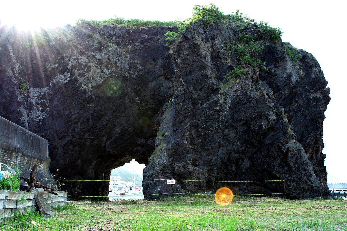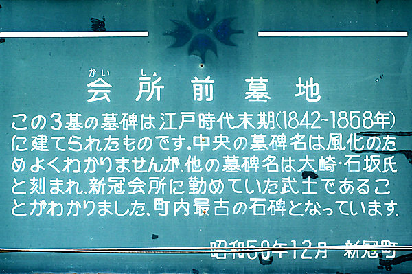 新冠町発祥の地と呼ばれている判官館の前浜(崖下)の3基の墓標。江戸時代に新冠会所で勤務していた武士であることが判明しています。1858(安政5)年のは石坂与十郎の墓。1841(天保12)年のは大崎千蔵の墓、他の1基については無名。1812(文化9)年から請負制が復活し、東蝦夷地は19場所に統合され、ニイカップ場所は箱館の浜田屋が1813(文化10)年から1869(明治2)年の請負制度廃止まで独占した。会所廃止後は駅逓として使用されたようだ。武四郎は安政3年10月と安政5年の7月と8月に訪れ「竹四郎廻浦日記」に「峨々たる断崖の岬を廻りて砂浜の上に会所一棟」と、東蝦夷日誌には「船々遠浅にて潟無故に、産物積取時も沖掛り、時化荒候時は逃船とす」「満汐また風波の日には、会所元より九折を廻り此峠を判官館と云、四方よく眺望す」とある。干潮時は馬で川を渡ったようです。静内会所跡には節婦漁港の東側、昆布干し場用道路入り口からはいり判官館ふもとまで徒歩30分程です。松浦武四郎は安政3年9月と安政5年7月に宿泊しているが、弘化2年の知床往復の時も宿泊したと思われる。◇所在地:新冠郡新冠町字高江