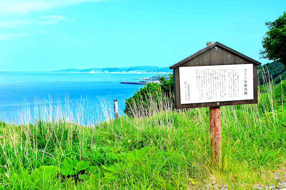 西口の山道起点は冬島川にかかる「押木橋」なのだが、コトニ小休所だけが目的の場合は「東冬島トンネル」を抜けて左折(山側に入る舗装路)し山道に入る。突き当たりに様似山道と林道の看板がある所で林道側に左折すると昆布干し場の奥にコトニ小休所の看板が見え、右折すると様似山道につながる。コトニ小休所の由来書によると2間に3間の小屋で往来の人達はここで焚火をして暖をとったり、時には仮眠もしたという。松浦武四郎の東蝦夷日誌に「コトニ(小川、小休所)此処より会所元よく見ゆ」「昔コトという胡女爰にて死せりしが、其墓印より木目萌出しをもて號しと」とある。廻浦日誌では「昔此処に土人小屋有、其先祖コトニと云へる女の子到て美女なりしとかや、その女の子此処にて死せしより号る也」と、地名の伝承があったようです。◇所在地:様似町コトニ