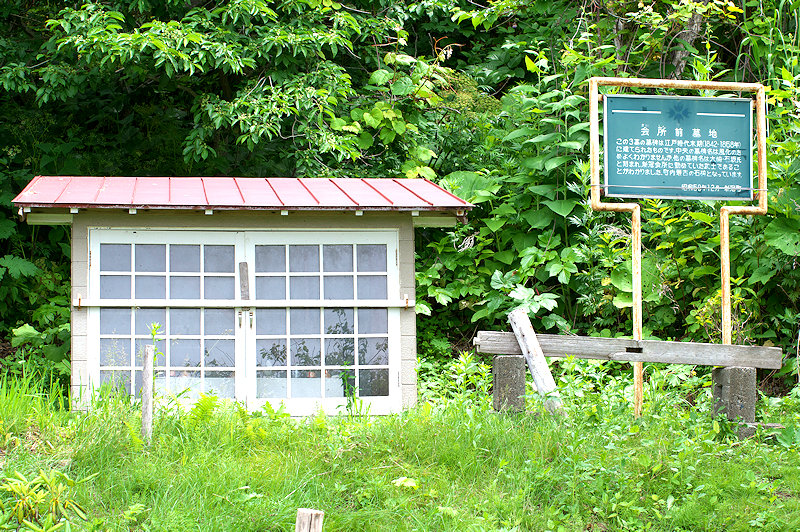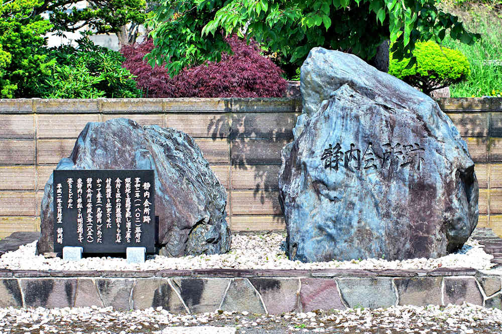 かつて静内にはシビチャリ場所と東方の海岸部を中心にしたシツナイ場所が有ったと云うが東蝦夷地が幕府直轄地となった寛政11年時に統合され、運上屋は元静内川の河口部(春立)に設置されたが、安政5年に東静内(モンヘツ)に移転、場所請負人では文政以降は万屋専左衛門の独占場所でした。会所跡碑は国道235号線沿い山側にの民家前に設置されている。幅3mの台座に高さ1m前後の青石二つが並べられ、碑文のほかに会所建物の当時の造作を刻んだ銅版の副碑もある。松浦武四郎の東蝦夷日誌に「シツナイ(会所・勤番所・板蔵・馬や・蝦夷雇蔵・備米・土人七軒)弁天舎(金比羅・いなり社)下に小流あり、是を以て號し、本名フツナイ也・・・・船は会所前五六石を繋ぐ」とあり、弁天社は後に移転して金刀比羅神社となっている。松浦武四郎は弘化2年の旅で静内会所に泊まっているようですが、安政の踏査行は三石での宿泊だった。◇所在地:新ひだか町東静内61番地13