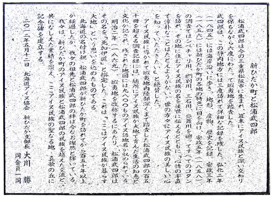 松浦武四郎は六度に渡って蝦夷地を踏査、そのうち三度、新ひだか町を訪れている。以下は碑文より転載「新ひだか町と松浦武四郎 松浦武四郎は今の三重県松阪市に生まれ、幕末にアイヌ民族に深い交わりを保ちながら6度にわたり蝦夷地を踏破した。武四郎はこの静内地方には3度訪れて詳細な記録をのこした。弘化2年(1845) には海岸沿いを歩き、地形、産物、歴史を記録。安政3年(1856) には新ひだか町の各地の特徴に目をむけ、安政5年(1858) の調査ではシベチャリ川、捫別川、三石川、鳬舞川を遡ってすべてのコタンを訪れ、その地に住むアイヌ民族の名を後世に伝えるとともに「心情の素直で素朴なことはことはたとえようがない。世の方々にアイヌ民族の美しいことを知って頂きたい」と絶賛した。アイヌ民族に導かれて蝦夷地内陸部深くまで踏査した松浦武四郎の150冊を越える調査記録には、随所にアイヌ民族が大地で育んだ生活の知恵と文化が記され、残された地図には9800ものアイヌ語地名が納められている。明治2年(1869) 蝦夷地を改称するにあたり松浦武四郎はその名を「北加伊道」と選定した。これは「ここはアイヌ民族が暮らす大地」という思いを込めたものである。北海道の名付け親・松浦武四郎が新ひだか町を訪れてから150年以上経過したが、我々の祖先と松浦武四郎の絆は今なお燦然と輝いている。我々は、新ひだか町のアイヌ民族と松浦武四郎の民族を越えた交流と、ともになしえた業績を讃え、ここアイヌ民族の聖なる地、真歌の丘に記念碑を建立する。2012年5月12日 北海道アイヌ協会 新ひだか支部長 大川 勝」国指定史跡「シベチャリチャシ跡群」を含む一帯が公園でアイヌ民族にとっては聖なる地、英傑シャクシャイン像、神器カムイパスイを形取ったというユカルの塔、シペチャリチャシ跡の看板奥に柵で囲われたチャシがみえ、中に入るとシャクシャイン城址の碑がある。展望台もあり見晴らしはそれなりによい。◇所在地:新ひだか町静内真歌441 真歌公園内