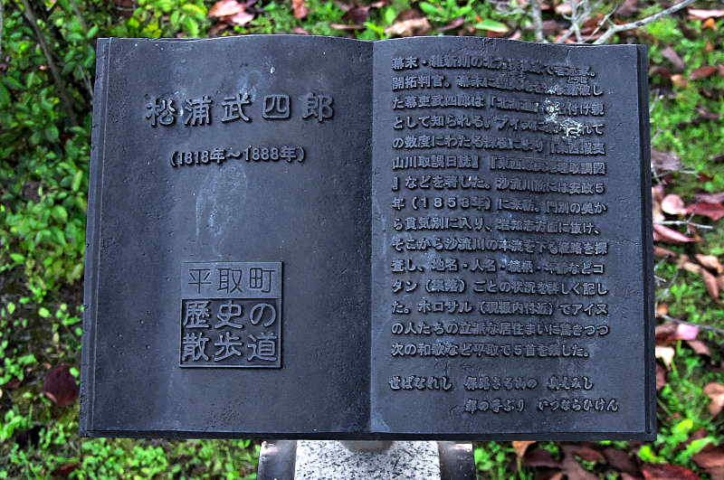 「平取町百年記念史跡 歴史の散歩道」で平取町アイヌ博物館前のブック型レリーフより転載『幕末、維新期の北方探検家で著述家。開拓判官。幕末に蝦夷地を探検踏破した幕吏武四郎は「北海道」の名付け親としてしられる。アイヌに案内されての数度にわたる探検により「東西蝦夷山川地理取調日誌」「東西蝦夷地理取締図」などを著した。沙流川筋には安政5年(1858年) 来訪。門別の奥から貫気別川に入り、岩知志方面に抜け、そこから沙流川の本流を下る経路を探査し、地名・人名・続柄・年齢などコタン(集落) ごとの状況を詳しく記した。ホロサル(現振内付近) でアイヌの人の立派な居住まいに驚きつつ次の和歌など5種を残した。世ばなれし 保路さる山の 奥えみし 都の手ぶり いつならひけん」とあった。東蝦夷日誌では「ニブタニ(東小川 畑有 人家廿七軒)名義、昔し此處の細工人小太刀を作り、其柄に金物を三ッ附て奉りしと云故事有」と二風谷昔から名工がいたようですね。歴史の散歩道には平取と縁のある教育、文化、福祉などの分野で活躍した9人を讃えるため二風谷湖の管理道路に平成11年10月に碑を建立し歴史の散歩道として整備した。金城マツ・金田一京助・イザベラ・バード、近藤重蔵・ジョン・バチラー、エディース・メアリー・ブライアント、ニール・ゴードン・マンロー、違星北斗諸氏のレリーフがあった。金田一京助は萱野茂アイヌ資料館前に、違星北斗は二風谷小学校敷地に歌碑がある。◇所在地:沙流郡平取町二風谷