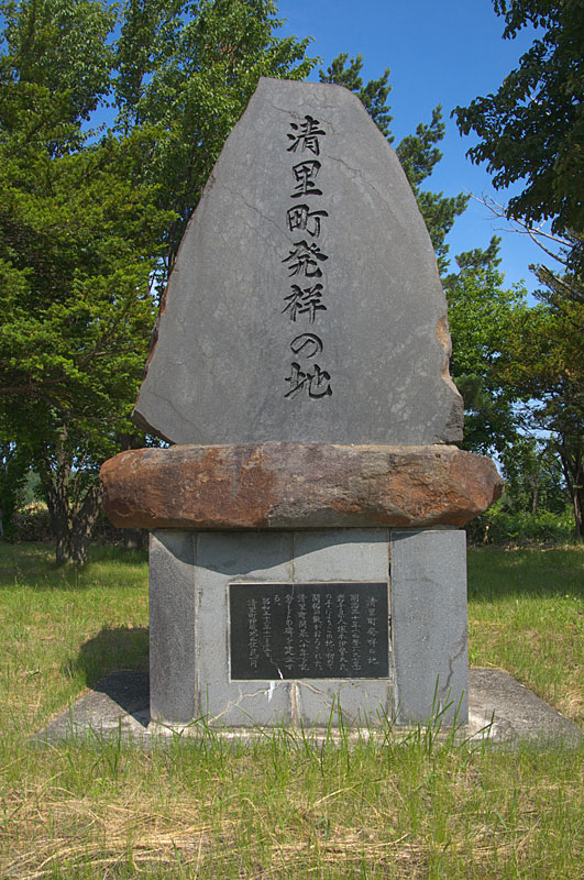 碑文から「明治30(1897)年、塚本伊勢太氏の手により、この地に初めて開拓の鍬がおろされた。清里町開基80年を記念しこの碑を建立する。昭和51年11月15日 清里町神威地区住民一同」 塚本伊勢太氏は岩手県出身で明治24年に野川道路に開設された「野川駅逓」の2代目管理人に就任(明治25年~)、明治30年に神威10線21号に転住入地したのが、清里町最初の和人定住とされています。「野川駅逓」跡には小清水町が設置した「野川駅逓跡の碑」がある。でも発祥の地碑が出来る前から人はいた、和人入植記念碑ならばわかるが。