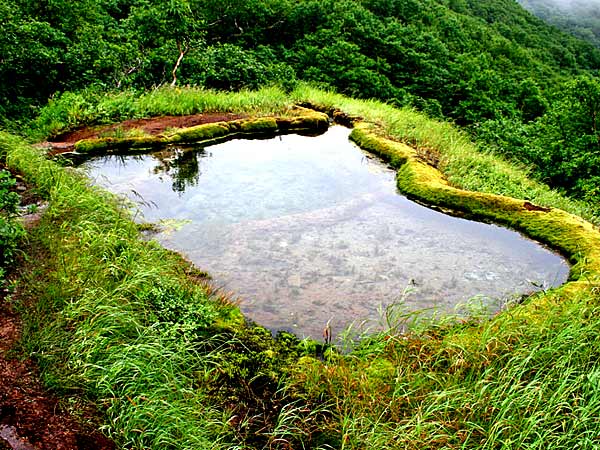 斜里岳登山道の上二股から新道コースを少し降りた所で右側に見えてくるのが「龍神の池」時間に余裕が有れば新道コースから別れ龍神の池を経て再び新道コースに戻り下山するのも良い。湧水で透明なのですが鉄イオンを大量に含み鉄分が沈殿してできた褐鉄鉱床で「鉄釜」と呼ばれる畦のような仕切りが形成されて3つほどに分割されています。俗に言う金気の強い水で飲料には適さないが不思議な景観は神秘的。ここから流れ出した湧水は龍神の滝となってやがて斜里川へ・・龍神の池の先にある小さな湧水が名水と言って良いほどの水で飲用に適している。