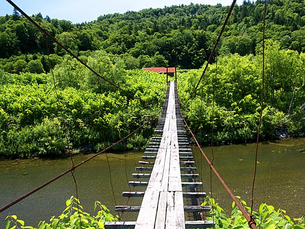 元々は木製の吊り橋で後10年ごとに修復して使われていたというが、昭和40年に鉄製に生まれ変わった。現在の橋は、平成4年の洪水災害の際に流された橋に変わり新たにかけられたものという。長さは約80m、幅1m、橋の上から見る遠別川上流の景観が魅力だったが、敷き板は腐り危険で渡るのは無理、写真スポットには良いかも。道道688線大成地区。