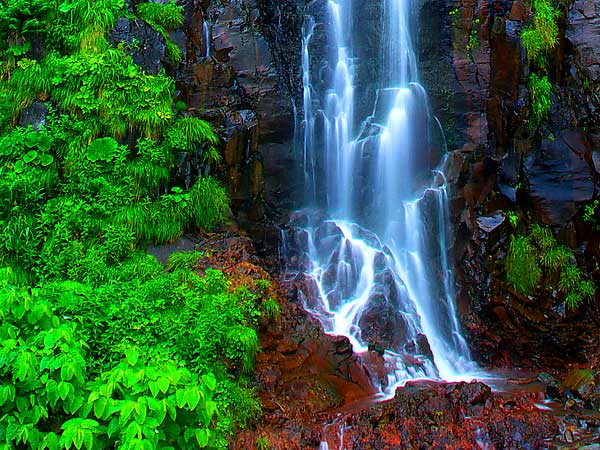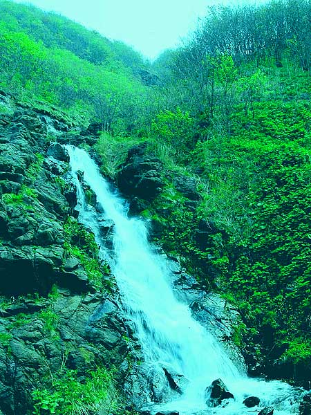 白銀(しらがね)の滝のすぐ近くで遙か頭上から流れ落ちやがて瓦礫の中に消えていく。ただ滝の下部は樹木の影に隠れて良く見えません。この滝も春先の水量が多いときは豪快です。白銀の滝より増毛側にあり「あっちの滝」とも呼ばれています。断崖の上に有るので見落としてしまいそう。◇所在地:石狩市浜益区 ◇備考:高さは15m、幅10mくらい ◇駐車場:白銀の滝駐車場利用