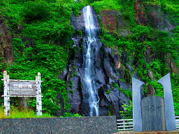 飛沫が駐車場まで飛んでくる。昭和56年に国道231号線が開通し開通記念碑が建てられている場所に白銀(しらがね)の滝がかかっています。岩肌を激しく流れ落ちる涼感が最高です。増毛町との境界の浜益寄りにあります。特に春先は水量が多く豪快で遠くから見ても目立ちます。この滝は別名を「こっちの滝」ともいい、銀河の滝に対して呼ばれている。白銀の滝と銀河の滝は石狩市に属する。◇所在地: ◇備考:高さは25m、幅は5mくらい ◇駐車場:専用駐車場あり