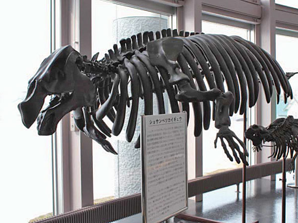 初山別村明里で約40年前に発見され豊岬小学校の理科室に保管されていたのが1.200万年前の胎児を伴う世界初の海牛化石である事がわかり「初別山海牛」と命名され平成2年から5年がかりでクリーニング、ほぼ完全な形で復元された日本最古の海牛類化石。化石は胎児でも体長約1.5mあり、母子の化石レプリカを自然交流センターに展示。道内で発見されている海牛類は冷たい海を好むのが殆ど「初別山海牛」は暖かな海に棲んだ仲間と今までとは別タイプ。現在は暖かい海にすむジュゴンとマナティーがその仲間です。