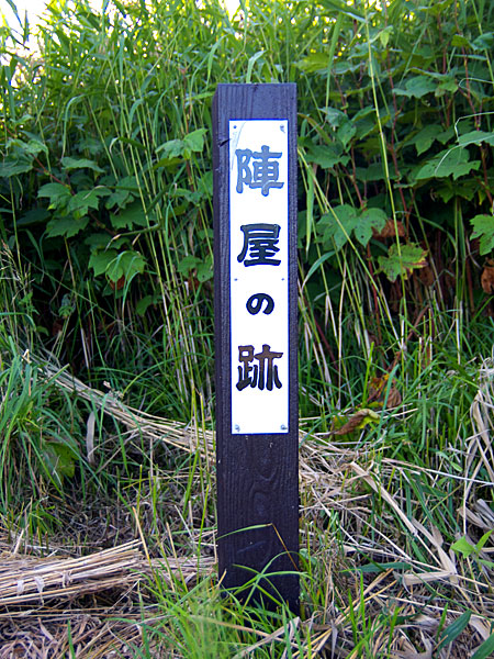 留萌方面から苫前町市街地方向に国道232号線を進むと、古丹別川という川にかかる橋を渡ると、その先の右側に「水田発祥の地」の案内板が有り石碑もたっています。その石碑を通り過ぎてすぐ左に入る細い道ヘ入る。道がすぐ分岐するので左側に進むと右側に「陣屋の跡」の標柱があります。幕府から蝦夷地警護を命じられ庄内藩は、浜益・留萌地方(増毛を除く)を拝領し1859(安政6)年、苫前に陣屋を置いた。戸田惣十郎が父について1863(文久3)年、苫前で在勤、1864(元治元)年に浜益の陣屋に移り、1865(慶応元)年に帰国する。1869(明治2)年、開拓判官に抜擢された松本十郎(原名は戸田惣十郎であるが朝敵藩出身である事を隠すために改名したとされる)は移民団130人を連れて根室に入った。1873(明治6)年、大判官として札幌に赴任する途中に立ち寄り、この陣屋の番頭だった石川小兵衛の墓に参ったという。その墓所も近くに有ると言うが一面笹原で入れるような状況でない。松本は「アツシ」と呼ばれる衣装を大切に身に着けていたことでアツシ判官とも呼ばれたが、アイヌ民族の処遇を巡って黒田と意見が合わず下野している。判官としてのアイヌ民族に対する態度は松浦武四郎に通じるものがある。武四郎が訪れたときは河口部に渡し守の家があっただけ。武四郎が古丹別踏査をした翌年(安政6年)にできた陣屋だが増毛の秋田藩陣屋跡や浜益の庄内藩陣屋跡とは違い痕跡すらなく今は標柱が有るのみ。◇所在地:苫前郡苫前町香川