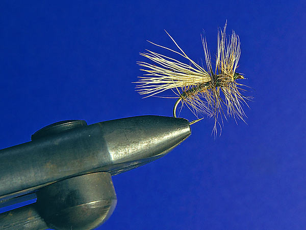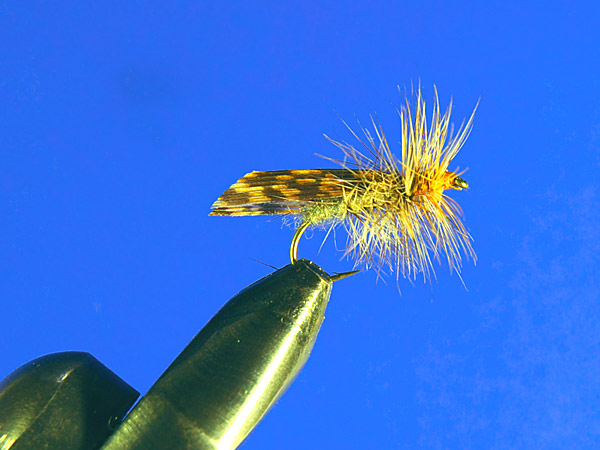 ウイングはミンクテイルを使用するので浮力は落ちるが耐久性はかなり高くなる。浮力の調整はフロントとボディのハックルが基本なので、巻くときの密度や長さで調節と云う事になる。更に浮力が必用な時はウイングにエルクヘアーを使用すると良い。色はどちらかと云えば鮮やかな感じで視認性に問題は無い。触角をとればフロントハックルのカディスと殆ど同じ。