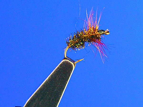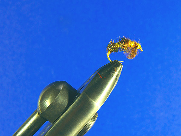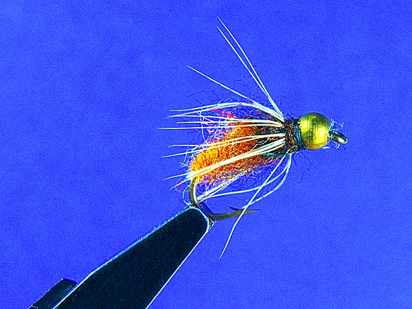 カディス ピューパと云う点では同じなのだがヘットにシンカーとなるビートを付けていること、沈むときは頭からテンションをかけると頭から浮くと云う事で、餌づりの竿でも使用可能。昔から有るアユの毛バリに似ている。外国では鉛の使用が禁止されている所も有り、ビードヘッド使用は一般化しているようだ。管理人は沢登り時の持参フライとして餌釣り用のシステムでも使用していたフライ。