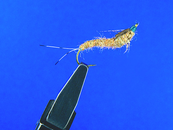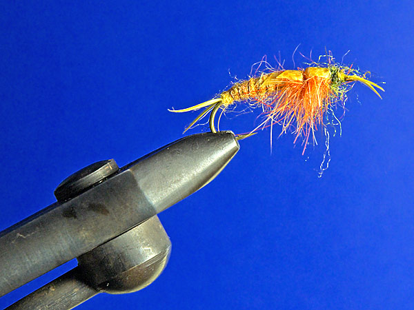 ヘアズ・イヤーに近いシルエットだが全体にスリムな作りでヘットのカーブがアップした作りとなっている。これが他のニンフと比べて特別に釣れると云う訳ではないが使い勝手が良い。色の選択と目玉を付けタイインクを工夫すればエビフライにもなりそう。