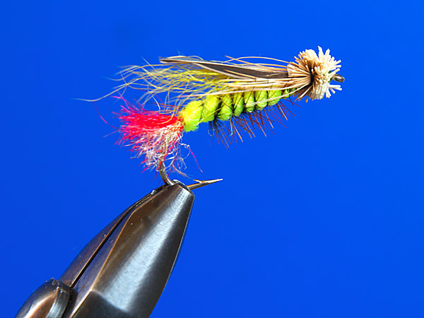 特定のバッタと云うわけでなくバッタ全般をイメージし見やすいようにアレンジしたフライ。実際にバッタ類が捕食されている事は少ないので、確実性と云う点では信頼性に欠けるが、意外と大型魚のアタックが多いという印象。