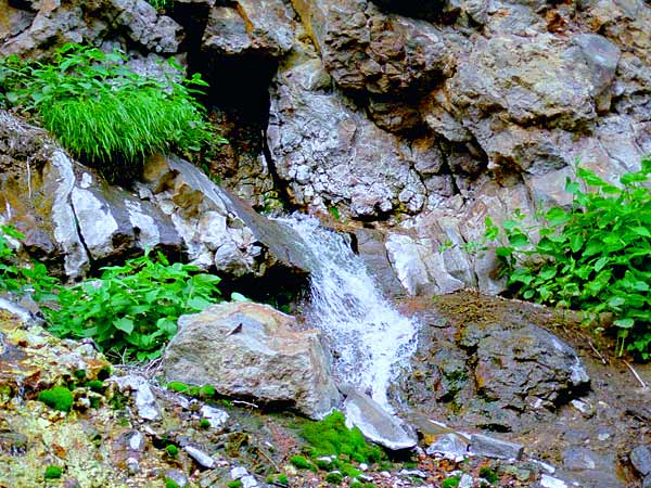 登山口は新富良野プリンスホテルの裏、車はホテルの駐車場に置かせてもらいましょう。登山道はホテルから林の中の単調な道を登りまもなく沢に入るが、登る程に沢幅が狭くなり、右岸、左岸と渡渉を繰り返すが難しい渡渉はない。ここで問題なのは滑りやすい事。登山口から1時間半程で伏流水が穴の中から流れ出している仙人の泉に到着する。湧水量は多いが、金鉱跡と云うだけにミネラル成分が多いのか、飲んでそれほど美味しい水では無い。◆富良野西岳登山道 金鉱跡手前