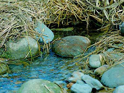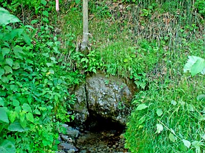 上富良野から鳥沼方面に進み東中地区の羊ヶ丘ラベンダー園の看板から左折、ペペルイ零号線を進む、ラベンダー園を過ぎてまもなく本幸から中富良野方面に右折し坂を下る途中に人参の集荷場がある。敷地内にはふたつの水道の蛇口に引かれた湧水が流れっぱなしになっていて水くみの人の姿も見られるが、普段はここで野菜を洗うのだろう。集荷場の裏の森に湧水口があり流れ出た水は冷水川となり沢を下る。◆中富良野町本幸