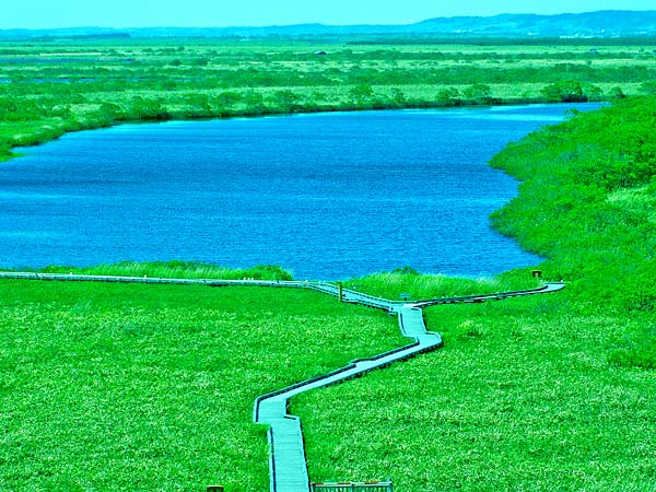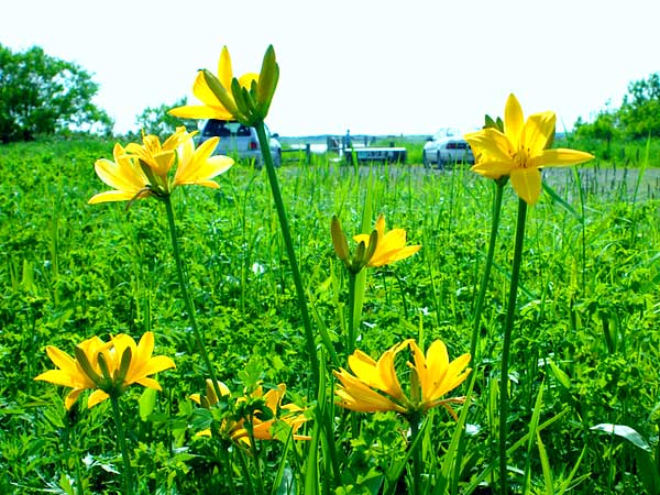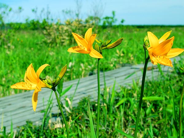 長沼からパンケ沼まで湿地を3kmほどの木道が続き、サロベツ原野の主な花は一通りみられます。6月から7月上旬が見頃。長沼の周りは遊歩道が回り込んでいて、谷地マナコなども観察できる様になっている。長沼は野鳥の撮影などで訪れる方も多いようです。中沼の遊歩道入口に幌延ビジターセンターが有り道路を挟んで近くに展望台が有りますが恐い思いをするかも。移動は下沼駅か南下沼駅を利用するか車を利用して行かれると良い。