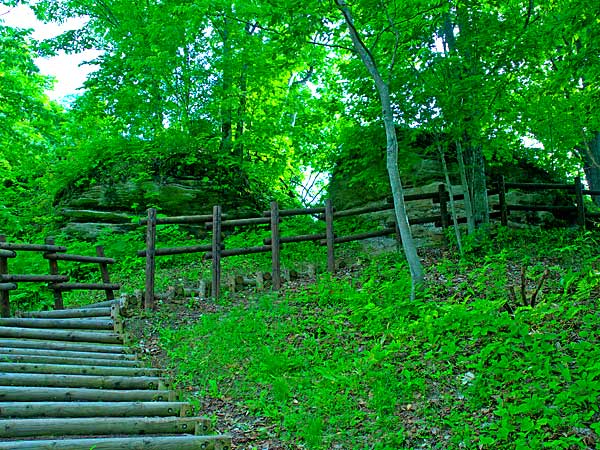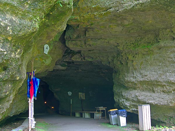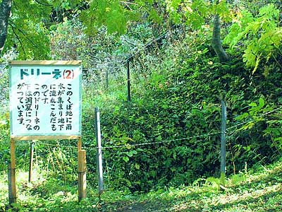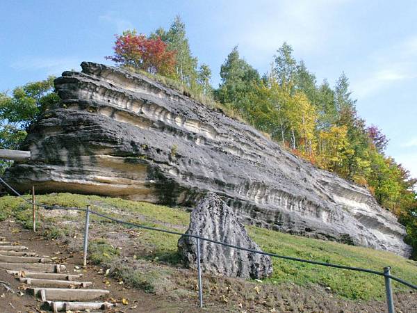 中頓別町市街から北東約4kmに、北海道で最初に発見された鍾乳洞で日本最北の石灰洞「中頓別鍾乳洞」があります。鍾乳洞の大部分は古生代や中生代の石灰岩中に出来たものですが中には新生代になって形成された鍾乳洞もあります。『中頓別鍾乳洞』新生代新第三世紀(約2.300万年前~160万年前)は中頓別層石灰岩中に形成された石灰洞で一帯が海底と言われた時代に主に二枚貝やフジツボ類の貝殻類が密集して堆積化石となった比較的新しい石灰岩帯の地層で、石灰岩の大元が貝殻で有ると言うことだけでも珍しいのに、更にその中に形成された鍾乳洞はその成り立ちが日本では極めて珍しく、学術的にも貴重な存在で、鍾乳洞の周辺一帯を含めて北海道指定の天然記念物に指定されてます。鍾乳洞の周辺では貝殻石灰岩が水に溶けて出来た特異な景観(溶食地形)が見られます。鍾乳洞の洞口は第一洞、第三洞、第四洞が知られ第一洞は主洞が60m、支洞が110m、完全な調査は済んでいないようですが、全長数百メートルと予想されています。第三洞は65m鍾乳石の発達がよいとのことです。第四洞15mですが公開されているのは第一洞です。見学ルートは主洞のみで高低差も15mほど。第一から第三支洞が交差していますが見学ルートには入っていません。見学ルート以外に入洞する場合は管理者「中頓別町」の許可を得てください。何処の鍾乳洞でも比較的容易に見ることの出来る鍾乳石、石筍、畦石、流石、花状石灰華などは第一洞では殆ど見られませんが〈昔は有ったと聞いているが見た記憶はない〉他ではあまり見ることの出来ないポケットやトレンチ、ノッチなどが見られます。中でも大きな波状溶食痕が見事です。鍾乳洞の近辺にはドリーネと呼ばれるすり鉢状の穴が見られ一帯には鍾乳洞が地下を縦横に走っているのを連想させ、『洞窟探検の穴場かも』。軍艦岩〈敏音知岳にも同名の岩がある〉は2.300万年前、海底で小さな貝類が密集し堆積化石となったものが地殻変動に伴い隆起し石灰岩帯を作り上げ、その後の浸食(溶食地形)で残った巨大な石灰岩塊の形が軍艦に似ている事から、軍艦岩と呼ばれています。駐車場から見ると板を重ねたような縞模様ですが、これは岩に含まれる石灰岩の量の違いで出来た文様ということです。鍾乳洞付近一帯を含めて中頓別町が、公園として整備しています。鍾乳洞には照明が有りますが部分的でシーズン中は懐中電灯を用意してあります。大勢でいく時は懐中電灯持参したほうが無難かもしれません。有る程度人数がまとまって行くとシーズン中は、ガイドさんから説明を聞けるかも。春から初夏には、遊歩道からチシマザクラや芝桜が観賞出来ます。特にシバザクラは見事です。中頓別の巨木にはピンネシリの千本しなの木が知られているが、一本の幹としては管理人が中頓別で見た最大の巨木がこの公園に有りました。それも第4洞の洞口の上に。鍾乳洞に寄られたら此処にも是非訪れて見てください。厳しい北の風雪に耐え時を刻んできた風格に圧倒されます。公園入り口付近に看板だけが立派な衣笠の滝『別名 羽衣の滝』が有る。ちいさな橋の側にこじんまりと名前に負けていますが。再訪2009.06.27