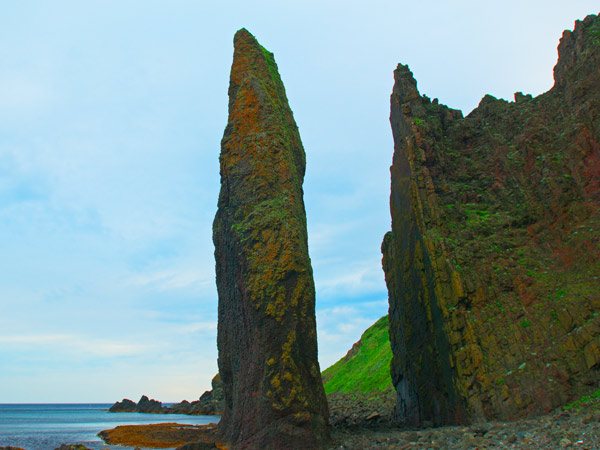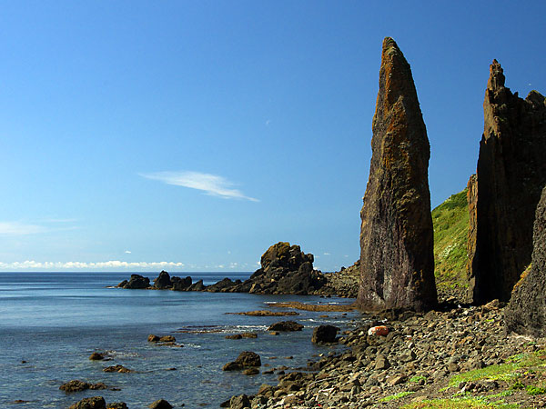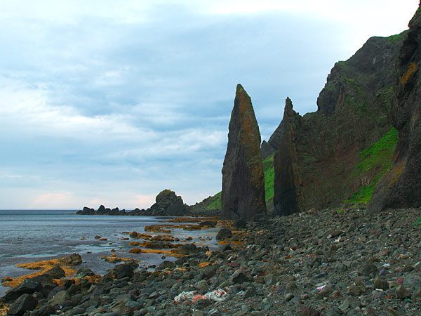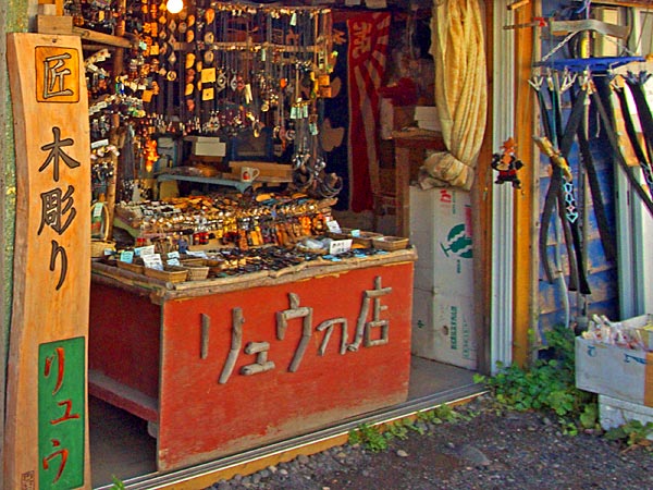 元地海岸にあるお土産の店は六時過ぎには店じまいだが「リュウの店」はよる九時まで営業している。若い方には細かい彫のピリカメノコのペンダントが人気の様ですが、ピリカメノコは右向き左向きがあります。地蔵岩の夕景を撮るのに時間が余り主人としばし歓談、コーヒーをいただいて感激。ここでは実用を兼ねてアイヌ文様の刺繍が入った八巻をパンダナ代わりに購入するが丈夫で使い勝手も上々。並んで隣にもう一軒木彫りの店があり、花柄の素晴らしいブローチ等が並んでいました。◆礼文町香深村元地