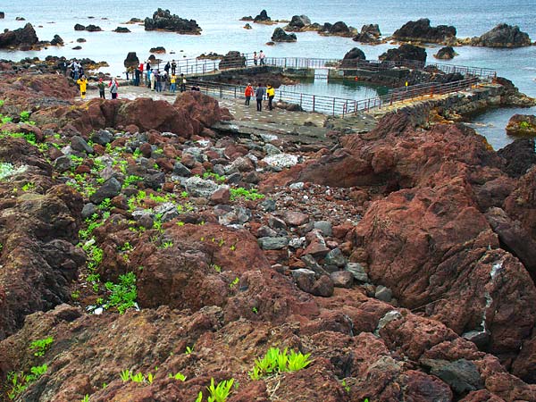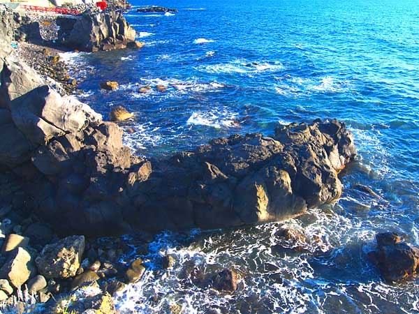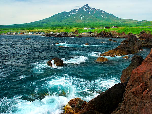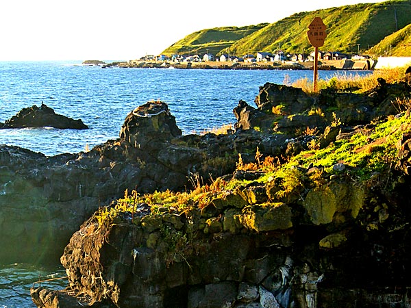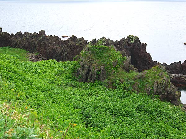利尻山噴火の時に流れた溶岩流が様々な奇岩となってダイナミックな景観を誇り、全景に広がる海岸草原では6月中旬から7月中旬にかけてエゾカンゾウが一面に咲き乱れ、彼方に礼文島を望むことができる静かなスポット。また目の前で剣山の様な岩峰が連続する風景も迫力があります。聞くところによると利尻一番のサーフィンスポットとか、確かに波はサーフィン向き。6月のカモメ繁殖期には岩場でカモメが繁殖している可能性があるので近づかない方が良いかも。