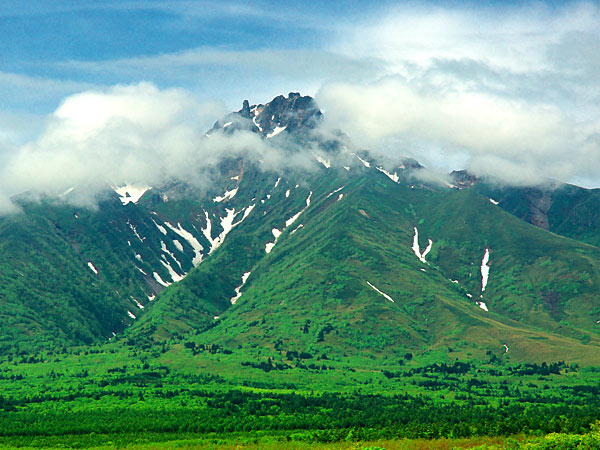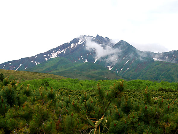 見返台園地(上の記事を参照)よりスタートし樹海の中を進み沓形港が樹間からチラチラ見えてきたら6合目、頂上まではおよそ4km。6合目からしばらく進むと次第に傾斜を増し森林限界を超えると利尻山の頂が見え眼下に山裾が広がってくる。やがてやがてブロック造りの避難小屋。更に登り続けると灌木帯を抜け岩の露出する稜線にでる。高山植物はこの辺から見られ登るほどに増え景観も広がってくる。コースは更に傾斜を増して馬の背状になっている狭い尾根上のきつい登りが続きやがて三眺山に到着。ここまでおよそ3時間はかかるが、経験や体力にあわせ更に時間の余裕をとっておく事。写真を撮るなら倍は見ておこう。ここからは沓形、仙法志、鴛泊の3市街が眼下に見え正面は切り立った西壁と鋭い南峰に続く南陵、右には仙法志陵が続く迫力満点の光景が広がる。山頂迄はこの後沓形コースの最大の難所を越えるが非常に危険で、沓形コースでは三眺山迄と言うのが無難な選択だ。三眺山迄なら登山初心者でも体力さえあれば登れるだろう。山頂を目指すならベテランの登山者以外は鴛泊コースの方を選択したが良い。
