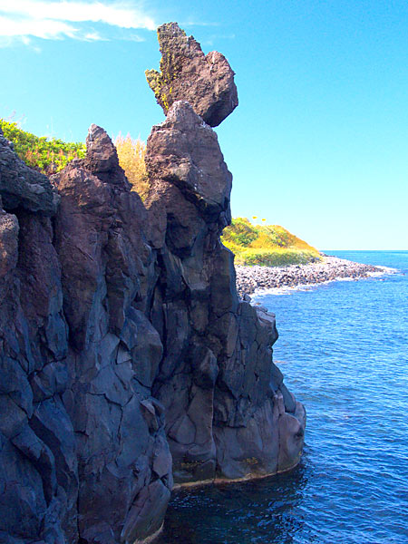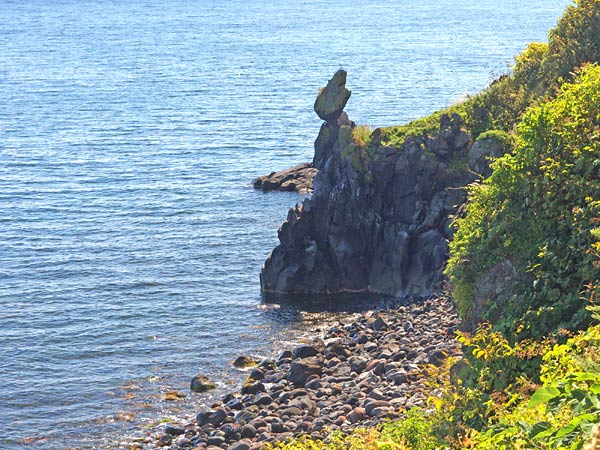 道路からは遠く見えるが断崖の下にあり近くに行くのは難しい。観音岩に降るルートを探している時に出会った漁師さんに貴重なお話を伺ったのでそれを要約して紹介。漁師さんの子供の頃(現80才過ぎたと云う)観音岩の(沖に向かって)右側に4件のニシン番屋と六個の井戸があり船揚場も有ったと云う。その頃は観音岩をオカムイ様と云い大切に扱われ信仰のシンボルであった。幕末の探検家である松浦武四郎が弘化3年9月に利尻島を訪れた際の記録や「西蝦夷日誌 巻之七」にカムイノカと言う所があるが、岬状で有り地形は一致。カムイは訛ってオカムイとも呼ばれるという事から観音岩の岩場がカムイノカと考えても良さそう。アイヌの時代からの信仰が番屋に引き継がれた形だが。当時の船揚場があった所は漁師さんが磯舟揚場として利用している。観音岩には昆布を運ぶため作られた今は使われていない作業道を利用しほぼ観音岩の真上近くから下るのだが岩場付近まで降るとかなり荒れている。雨天や時化の時は波を被ったり岩が崩落する可能性あり極めて危険。入り口の場所は近くの漁師さんに聞いてください。◇利尻富士町鬼脇字鰊泊