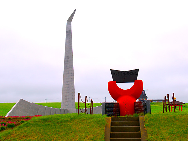 昭和58年9月1日未明、世界を震撼させた”大韓航空機撃墜事件”が眼前のサハリン西海域で起きました。「祈りの塔」は2周忌にあたる昭和60年9月1日に、遭難者の慰霊と世界の恒久平和を願い、サハリンを臨む宗谷岬の高台に建立されたものです。塔の周辺には地域の婦人部が世界平和の願いを込めて植栽したアルメリア花壇がある。
