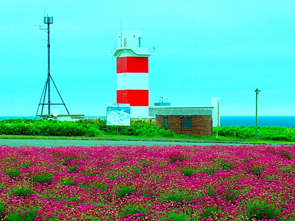 宗谷岬の突端から南へ120メートルの高台にあり、紅白のツートンカラーが鮮やかな四角い日本最北の灯台で、日本の灯台50選のひとつ。灯台の歴史は古く、道内では納沙布岬(根室)、日和山(小樽)に次いで、3番目に建てられ、明治18年9月25日に初めて点灯されました。1912年の二代目灯台を経て1954年に現在の三代目となった。灯台の高さは17メートル、海抜約40メートルの位置にあり、白い光は17.5カイリ(約32キロメートル)まで達し、宗谷海峡を航行する船舶の重要な目標物となっています。