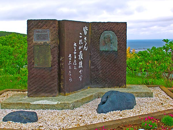 終戦直後の昭和20年(1945年)8月20日、ソ連軍の侵攻の中にあった樺太。その緊迫した状況の中、最後まで交換業務の任務を果たし、自らの命を絶った樺太真岡郵便局の9人の若き女性交換手たちを慰霊しています。屏風状の碑には亡くなった9人の名前、交換手姿の乙女の像を刻んだレリーフ、そして彼女たちの最後の言葉『皆さん、これが最後です。さようなら、さようなら・・・』の文が刻まれています。戦争は再びくりかえすまじ。平和の祈りをこめて尊き九人の霊を慰む。平成20年度文化芸術祭優秀賞を獲得した、日本テレビ開局55年スペシャルドラマとして放送された「霧の日」のモデルでDVDもまだ手に入る。