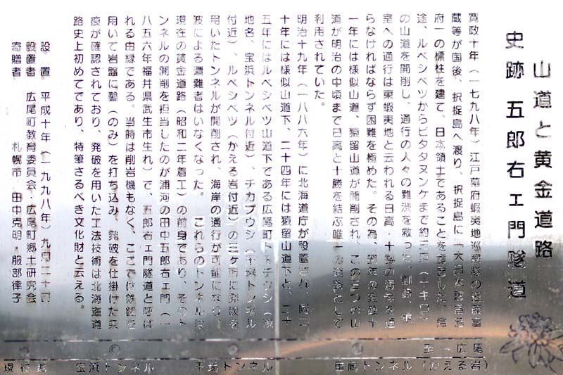 明治18(1885)年に太平洋岸沿いに道東に至る唯一の国道43号として指定され、北海道庁が発足した4年後に猿留山道下に海岸道路の竣工。明治25(1892)年頃にはルベシベツ山道沿岸にも海岸道路が開削された。監督は新井長蔵、道路工事は永岡庄兵衛、トンネル工事は浦河の田中五郎右衛門(五郎右ェ門と表記しているのもある)が請負ったという。ルベシベツ~タンネソ間海岸沿いの難所にトモチクシ、チカプウシ、ルベシベツの3カ所で墜道を掘り発破を用いた工法が採用されたと云い、北海道では初めて技術が用られい五郎右ェ門隧道と呼ばれ、広尾町の史跡となっている。海岸道路が完成してからも時化の時は山道を使う併用は黄金道路全通まで続きます。