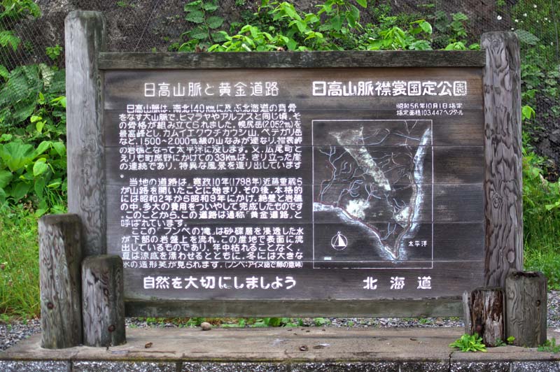黄金道路の旧々道となる最初の海岸道路は明治25年に開削された幌泉、茂寄間の延長約12里の道でしたが、海が荒れると通行出来ず山道が併用されている。その後昭和2年に本格的な海岸道路建設に着手、多大の犠牲と建設費を投じ満7年半をかけて昭和9年に日高山脈東側の海岸道路が全通する。建設費は巨額というが現在の貨幣価値にすると約60億円、黄金道路というほど篦棒な金額ではない。広尾側は6つの工区に分けられ、第二工区だったフンベと美幌の間が難所中の難所で、札を積んだくらい金を要したため黄金道路という異名が付けられたという。つまりは道路が完成する前の昭和5年頃からすでに黄金道路と呼ばれていた訳だ。戦後になってからも改良を重ね、昭和42年から本格的な改築工事に着手、昭和56年に一次改築が完了したが、現在もどこかで工事中と黄金道路と呼ぶにふさわしい結果にはなった。また道路全通で利便性は良くなったが、同時に漁場を失った漁民も少なくない。黄金道路の正式な名称は日勝道路(日勝国道)で、通行止めになることが際立って多い国道ことでしられる。道路全通記念碑がえりも町と広尾町の境界付近にある駐車帯にあります。所在地:広尾町ピケタヌンケ