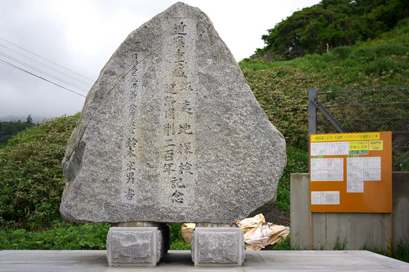 ロシア南下を憂慮した幕府は近藤重蔵守重らを北方巡察隊として派遣、4月に江戸を発った近藤は、東蝦夷地から国後島を経て択捉島に渡り「大日本恵登呂府」の標柱を立てたという。その帰途の10月、広尾から日高へ抜けるとき、荒れる海岸線の通行に難儀し数日の滞在を強いられた。近藤は私財を投じて従者の下野源助に新道の開削を命じアイヌ民族68人の協力を得、ルベシベツからピタタヌンケまで山間部を通る山道(ルベシベツ山道)を切り開いたが、これが東蝦夷地における道路建設のはじめという。また開削工事の経過を木板に漢文で刻み、十勝神社に奉納したのが「東蝦新道記」で、現存するのはその再刻版という。近藤重蔵にちなんで命名された重蔵隧道入口近くの石碑は東蝦新道記の内容を刻んであるようですが、文字は判読不能な部分が多い。またピタタヌンケ山道開削口の黄金道路沿いには数基の石碑や説明版が並んでいるも、近藤重蔵山道開削口と書かれた史跡標柱は工事中で撤去されていた。◇所在地:広尾町モエケシ