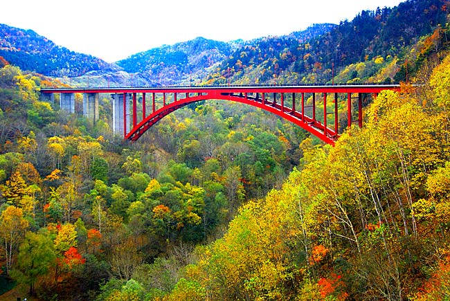 糠平湖は、初夏から秋にかけては湖畔のキャンプ場でキャンプ、カヌーやフィッシング、森林浴を存分に楽しめます。秋は湖面に映る紅葉が見ものですが、ダムサイトから観る紅葉も壮観。登山やスキー、釣と温泉が楽しめる北海道では数少ない所。冬のメガネ橋とワカサギ釣りは糠平湖の風物詩。