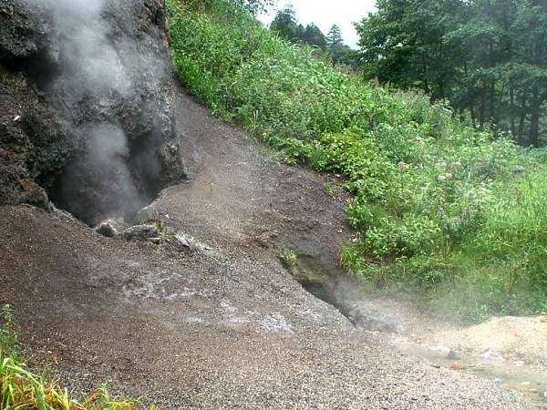 新得町屈足方面より十勝ダムを過ぎアスファルトが切れる所に曙橋があり、橋手前に沼ノ原温泉の案内看板がある。そこを右折して13kmの所にヌプントムラウシ温泉があります。分岐などに矢印や残りのキロ数が表示され迷うことは無いでしょう。ヌプン峠を越えて進むと、避難小屋の奥にヌプントムラウシ温泉が有ります。更に奥に行くと登山口との分岐となりその先はゲートで通行止め。林道はフラットで走りやすいがカーブミラーのないカーブが多いので運転は慎重に。温泉は無料で夏の間は登山者やハイカー&温泉マニアでにぎわいますが冬期間は閉鎖。露天風呂の横に脱衣小屋があり、湯は硫黄臭のする微濁透明で高温。沢水で湯温を調整する。今回は大雨で山も釣りもだめ、滝もだめということで残るのは温泉ということで、ヌプントムラウシ温泉へと向かう。急カーブの連続する林道を走ること20分ヌプントムラウシ小屋が見えてくる。緊急用の非難小屋だ。川を挟んで温泉の湯煙が立ち脱衣場がそばにある。先客が3人傘をさして入浴中だ。噴泉口では湯が吹き上げていてすぐ下の穴から流れ出し浴槽に導かれていた。写真を数枚撮って引き返す『何の事はない割り込む度胸がなかっただけなのだ・・・』そんな訳で残るはオソウシ温泉。屈足手前で林道へ約7kmほど走ると右側にオソウシ温泉が見える。入浴料500円を払い浴場へ、内湯は小さいのが一つでやや熱め、廊下状の所が洗い場になっていて屋外にある露天風呂につながっている。露天風呂は二つ、ひとつはやや温めでもう一個は加温してない源泉だ。何でも日本では珍しい強アルカリ泉との事で肌がつるつるに。先客一人でまるで貸切状態の入浴三昧となる (2003.8)